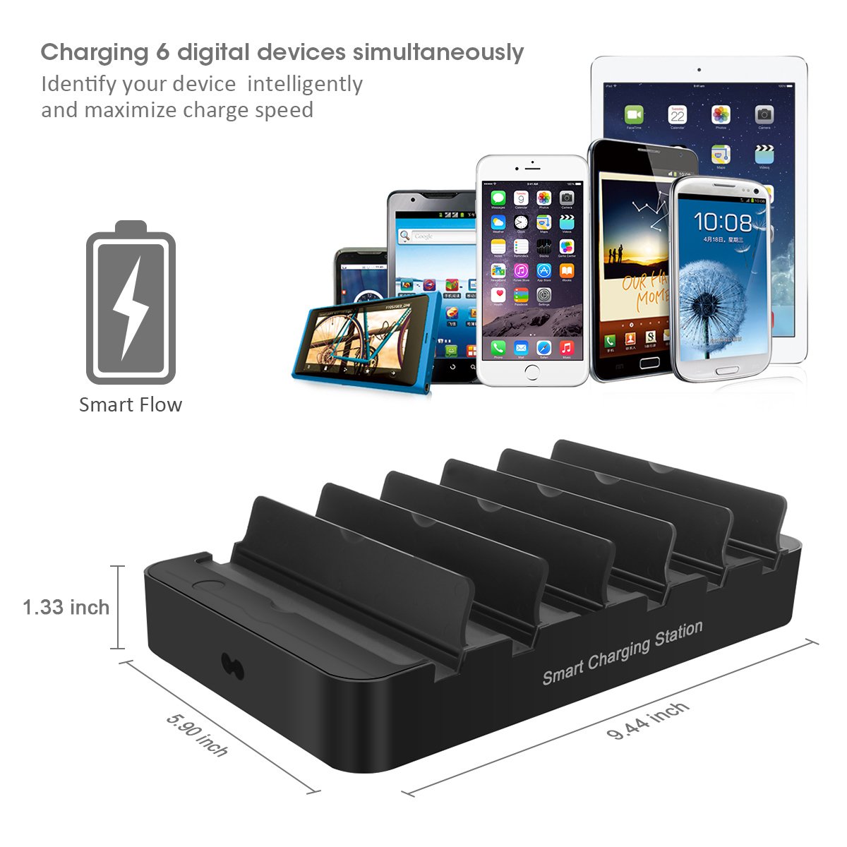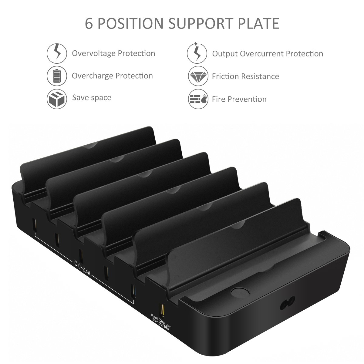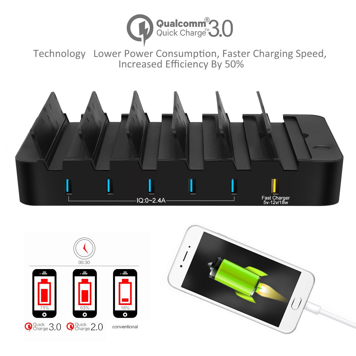 【Quick Charging】 5 port 5V 2.4A output and 1 port FC3.0*1 5V-10A(MAX) , 60W maximum total ports output allows you to charge 6 devices simultaneously.Includes superior, 12A MAX power output to quickly fuel up your smartphone or tablet. Charges TWICE as fast as the original factory charger !