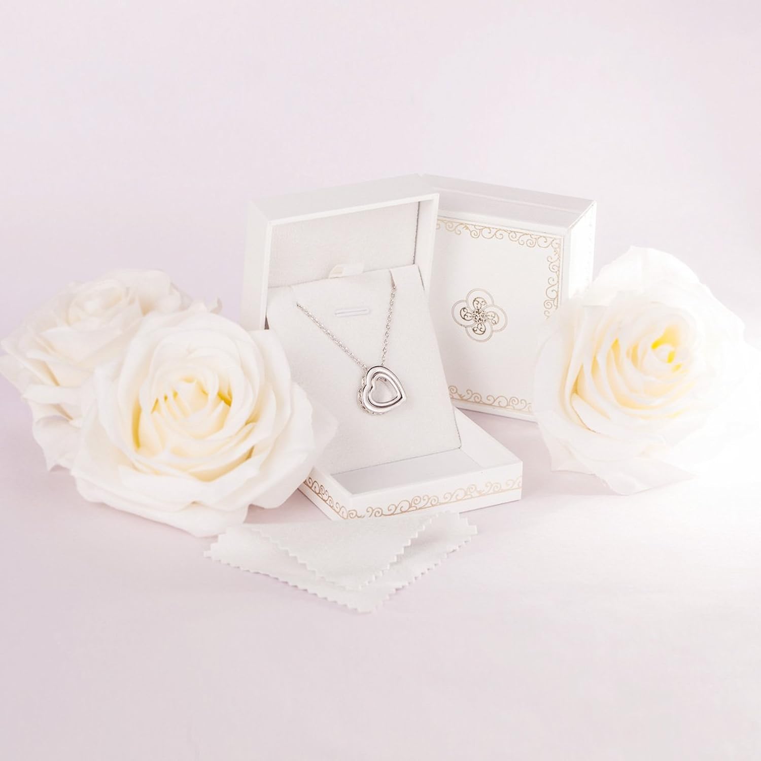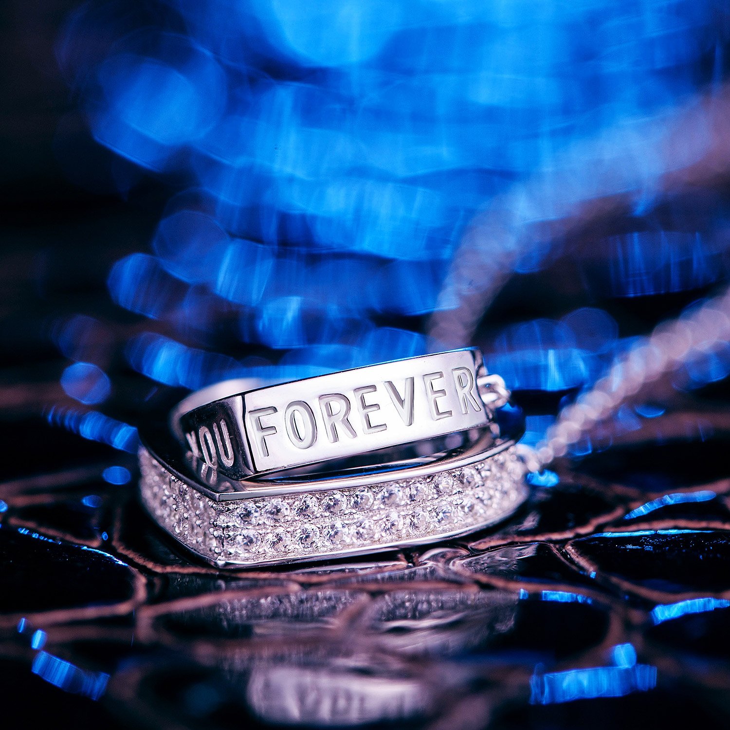 The outer heart sparkles with clear crystals set in pavé, adding a high level of sparkle. While the inner heart is engraved with "LOVE YOU FOREVER".