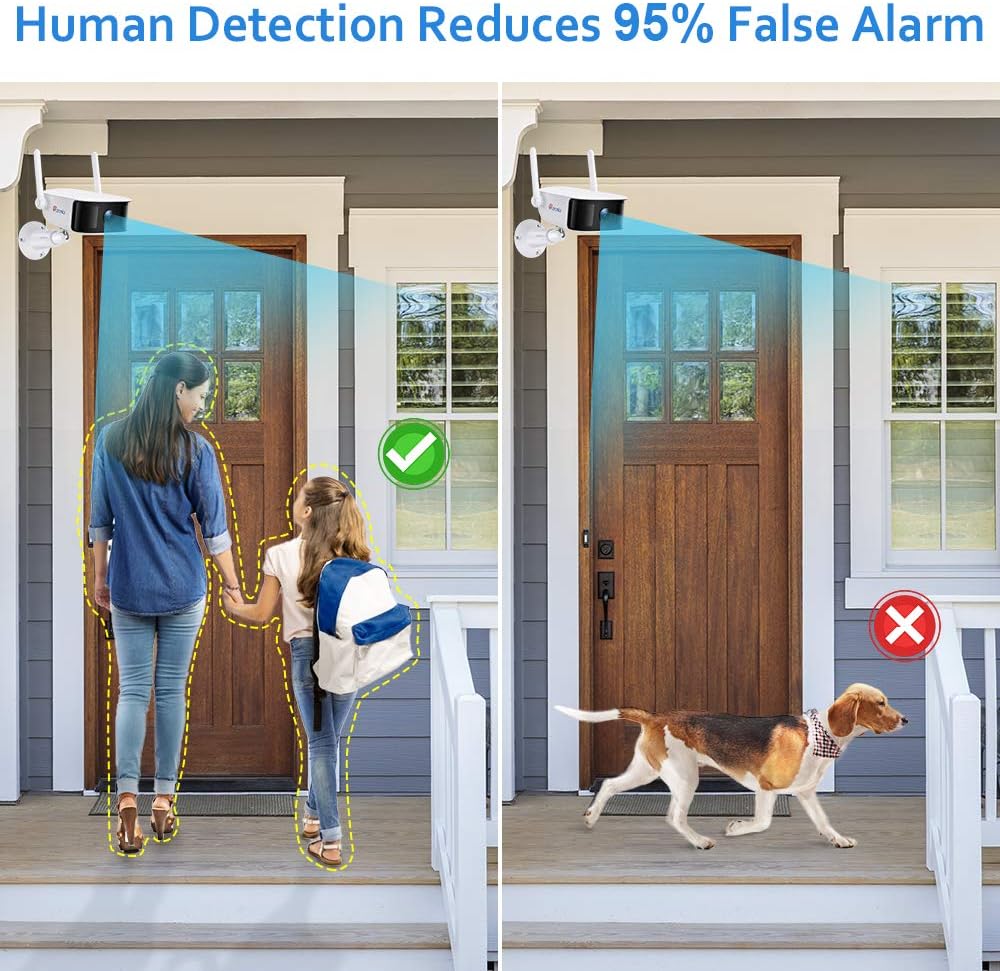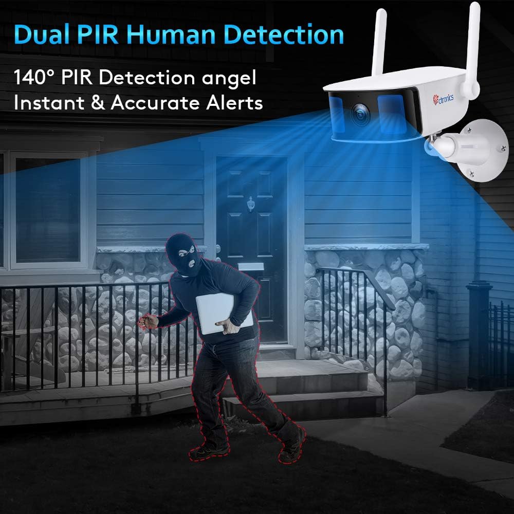 Dual PIR Human Detection & Accurate Alerts: Unlike usual cameras that support 80°-90° PIR and 4-5 m distances, our outdoor security camera has dual PIR motion sensors to provide a distance up to 9-10 m and a wider view up to 140°. Once the people are detected, a real-time notification will be sent to your smartphone immediately. If there are any other objects such as insects, rain, wind, it will not alarm.